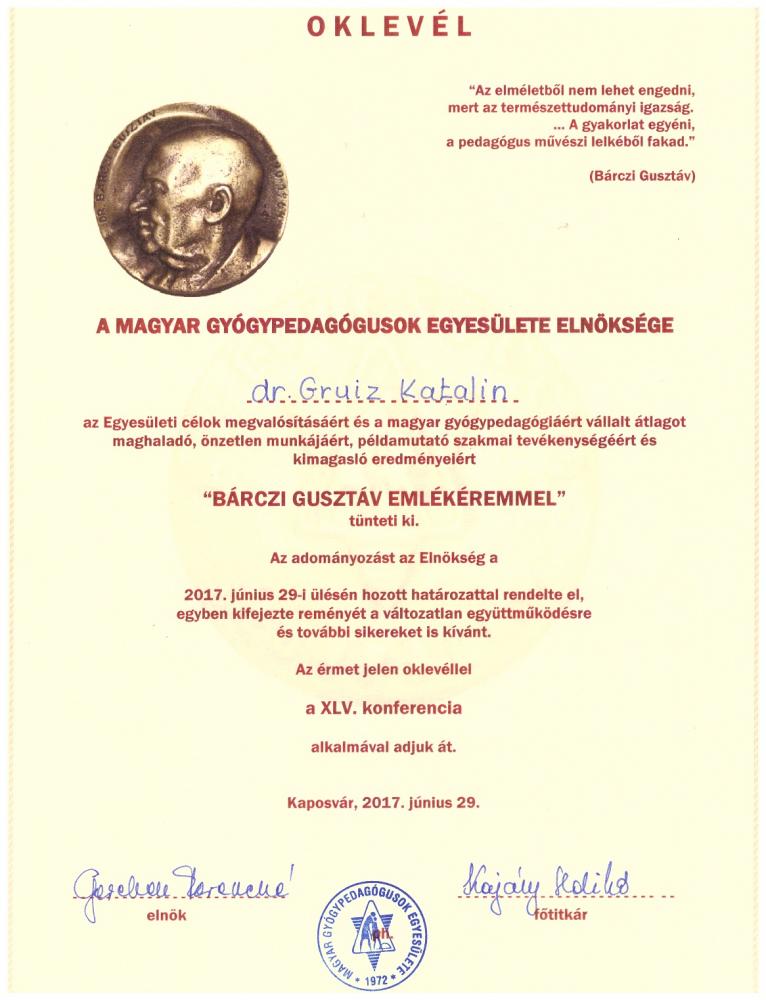 A Magyar Gyógypedagógusok Egyesülete idén a Down Alapítvány kuratóriumi elnökét, Dr. Gruiz Katalint tüntette ki Bárczi Gusztáv Emlékéremmel az egyesület célkitűzéseinek megvalósításában folytatott kimagasló munkája elismeréseként.