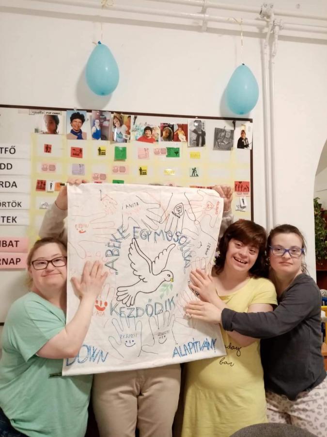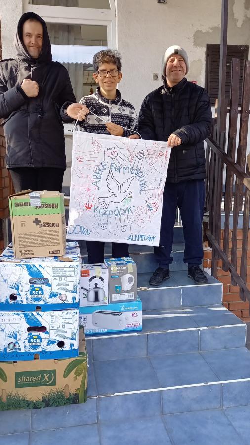 A Down Alapítvány Intézményeiben, Otthonaiban élő és dolgozó fogyatékos ügyfelek, valamint hozzátartozóik és munkatársaink a háború elől menekülő embertársaink megsegítéséről szóló felhívásra reagálva összefogtak, és különböző adományok (ruha, játék, édesség, takaró, ágynemű, élelmiszer, gyógyszer, kötszer, tisztítószerek, stb..) felajánlásával igyekeztek hozzájárulni a menekültek támogatásához. Bár fogyatékos ügyfeleink közül is sokan tudják, hogy még a legtöbb is, amit tehetünk a háború elől menekülő embertársainkért, az is kevés ebben a helyzetben. Ügyfeleink különböző módokon szerettek volna hozzájárulni ahhoz, hogy érezzék embertársaink, ahogy csak lehetséges, segítjük őket. Kedveskedtek rajzokkal és egy saját készítésű Békét jelképező zászlóval. Egy egész mikrobusznyi tárgyi felajánlás gyűlt össze a jelentős anyagi felajánlás mellett, melyet az Alapítvány munkatársai Nyírkarászra vittek el, ahonnan humanitárius folyosón keresztül került a rászorulókhoz.