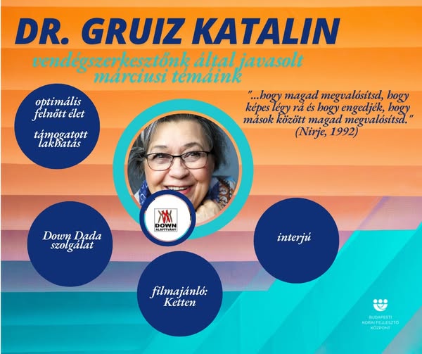 Márciusban, amikor a tavasz első napján a Down-szindróma Világnapját is ünnepeljük, a fogyatékos gyermekek és felnőttek életének egy-egy kiemelten fontos területével mi is foglalkozunk oldalainkon - olvasható a bevezető a Budapesti Korai Fejlesztő Központ oldalán megjelent írásban, ahol alapítványunk elnöke, Dr. Gruiz Katalin vendégszerkesztő volt. A Down Alapítvány elnöke olyan témákat javasolt körüljárásra, melyek a fogyatékos ember köztünk-velünk éléséhez szükségesek, amely cél egyben meghatározza az alapítvány stratégiáját és működését.