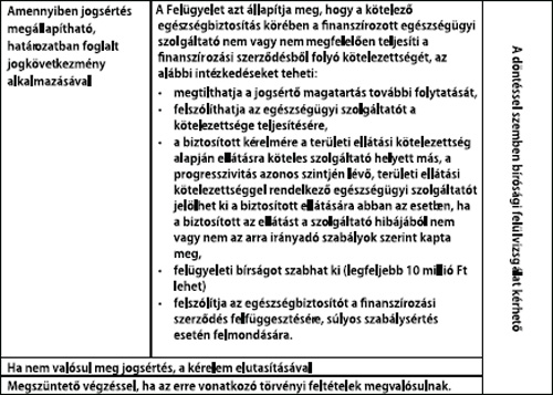 • Az Egészségbiztosítási Felügyelet az egészségbiztosítás hatósági felügyeletéről szóló 2006. évi CXVI. törvény hatályba lépése – azaz 2007. január elseje – után történt ellátásokkal kapcsolatos panaszbejelentésekkel foglalkozik. A Felügyelet eljárása igen hatékony. Az érintett az Egészségbiztosítási Felügyelethez fordulhat panaszával amennyiben a kötelező egészségbiztosítás alapján egészségügyi szolgáltatást vett (volna) igénybe és ennek során nem az elvárt ellátási minőséggel találkozott, így például